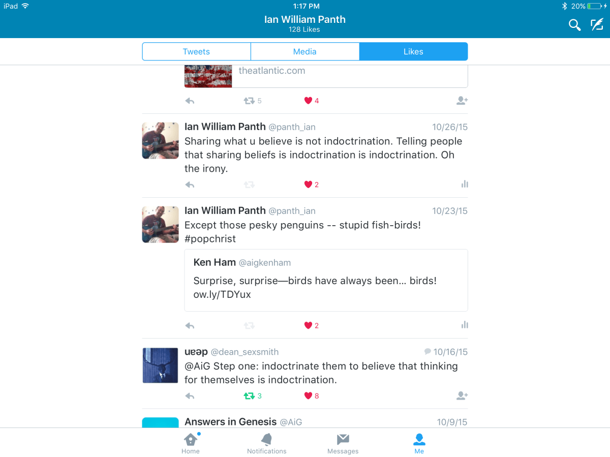 Now, during my short time on Twitter, it has come to my attention that many Christians are twits when it comes to Twitter. Given how I see my fellow Christians attacking, mocking, and berating, non-Christians (or anyone they assume is a non-Christian like me), I am not surprised that when I “come out” as a Christian on Twitter many simply assume that I am a jerk. Again, given what I see many other Christians doing in this public forum, I don’t blame atheists, neo-pagans, and, apparently, pandeists, etc. for assuming that I am an ass. (Of course, I assume I am not one.) I can only be patient and hope that their opinion of me changes through continued exposure and the occasional twitter interaction. I am hesitant to call this interaction dialogue although sometimes it comes close.