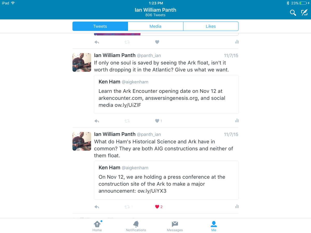 @non-Christian responds in a very straightforward way with a plausible alternative to Ham’s theory. He suggests that people in general and not secularists alone are convinced by the evidence. He also seems to be calling Ham on his intellectual dishonesty. Which, in my opinion, is also a fair challenge to raise. Of course, we tend to read tones of voice into tweets and e-mails but here there is nothing explicitly aggressive or provocative about this tweet. And yet . . .
